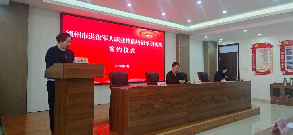 近日,德州市退役军人事务局正式公布退役士兵职业技能培训承训机构评估结果,我校凭借深厚办学底蕴、扎实教学实力和完善培训体系成功入选。3月20日,德州市退役军人事务局召开签约仪式,与我校正式签订《德州市退役军人职业技能培训合作框架协议》,开启校地协同赋能退役军人发展新篇章。签约仪式上,我校作为承训机构代表发言,并表达履责决心。